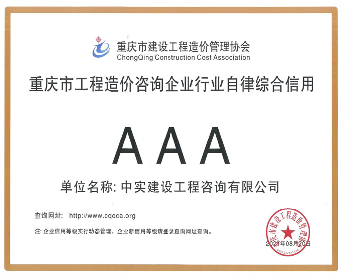 喜報!中實咨詢榮獲造價咨詢企業AAA級行業自律綜合信用評價等級